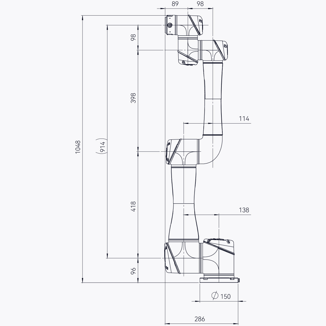 Elite Robots EC66 robotic arm (17.5kg weight; 1048mm total cobot length; Ø150mm footprint). Includes standard 5.5m cable (optional cable lengths are also available: 1.5m; 3m; 8m; 10m).