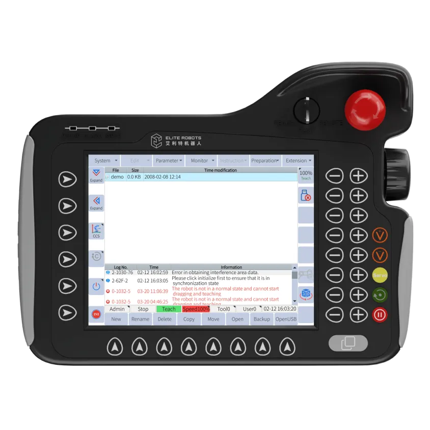 Industrial teach-pendant with 3-modes enable key and reserve keys for safe and convenient on-site operations. 8" touch-screen.